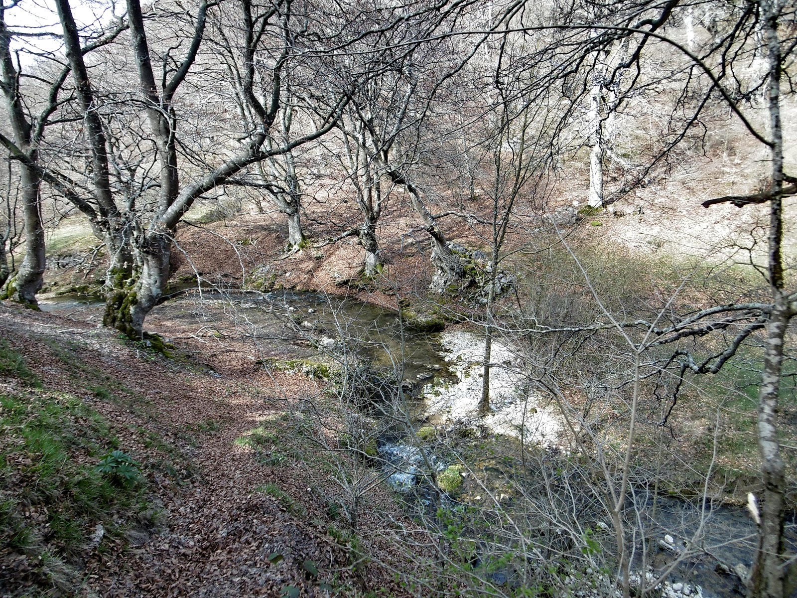 introduzco en un tupido bosque de encinas, robles y boj caminando hacia el Agujero del Ollo por el sendero marcado.