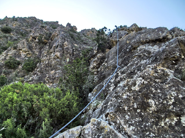 aseguramiento rápido con cuerda y multitud tramos de sirga como línea de vida. Va increscendo en